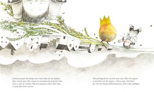Un livre magnifique qui invite les enfants à nourrir leur créativité et leur imagination. Avoir une idée, l’imaginer, la penser, la rêver, la voir grandir et puis en parler, en avoir honte parfois aussi, s’en détourner et puis s’y accrocher malgré tout jusqu’à ce qu’elle devienne réalité.