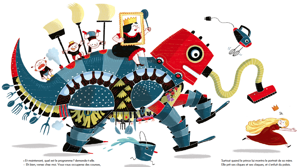 Cette histoire qui casse les codes du conte traditionnel avec beaucoup de malice, enfin une héroïne qui dit non au schéma classique et a soif d’aventure ! Quand le prince arrive enfin, elle réalise qu’enne ne veut pas de cette vie là. Alors elle part à l’aventure, tombe amoureuse et laisse son cher et tendre s’occuper de la maison dans un équilibre perso/famille intéressant 😉